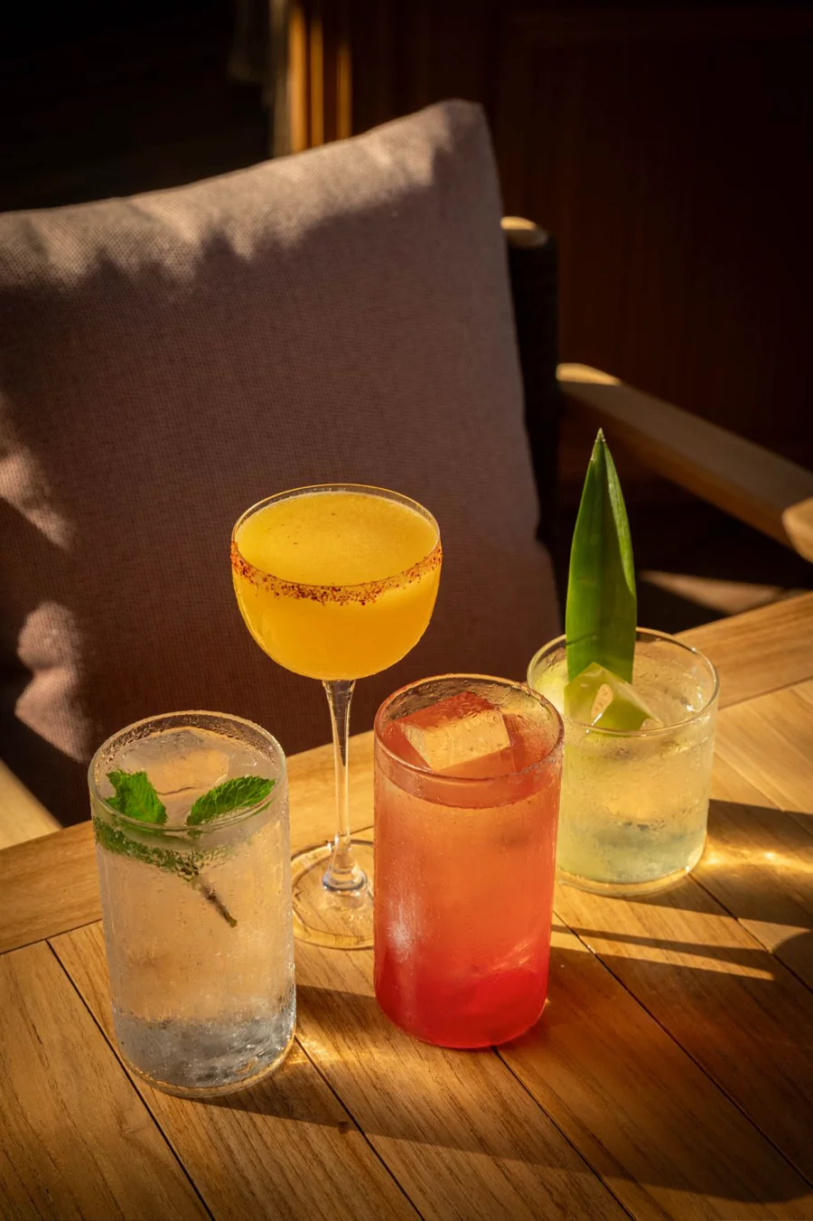 En contrebas, le restaurant dispose d’une plage privée qui déploie des rangées de beds aux matelas épais couleur terracotta. Dès la fin de matinée, une bande-son exclusive signée Coya Music installe une atmosphère chic et solaire, entre deep house et rythmes afro et latins avec une montée progressive en intensité à partir de 16h30, moment où le soleil amorce sa descente et où l’ambiance se transforme en apéritif festif.