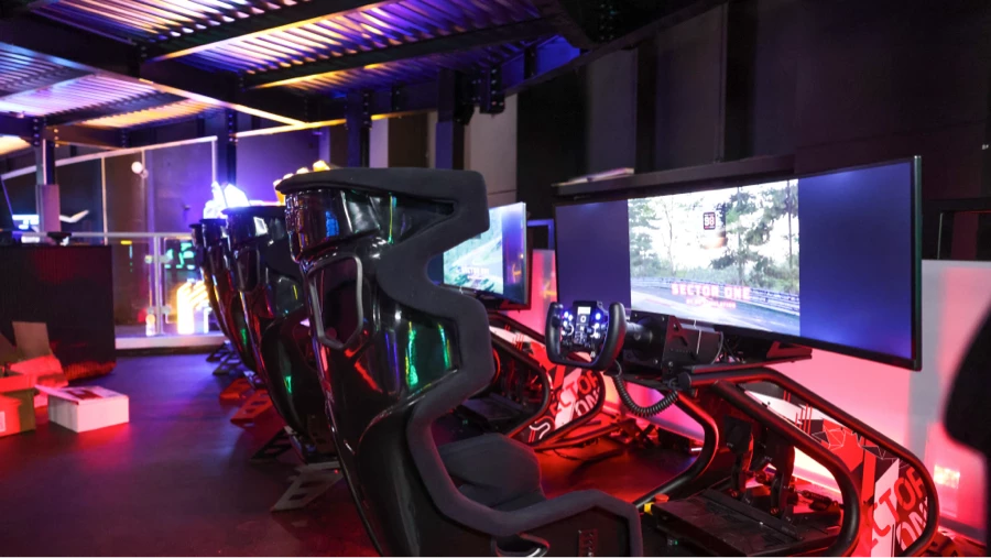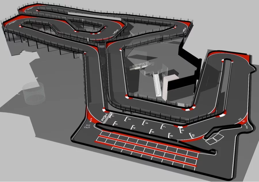 « Je pense que personne ne s’attend à ça. Les gens vont rester bouche bée », tease Clivio Piccione. La colonne vertébrale de la salle est une piste de karting de 400m de long, inspirée du Grand Prix de Monaco avec montées et descentes. Elle a été développée à plus de 80% hors sol, sur des poteaux métalliques. « C’est une première mondiale et une prouesse technique, qui nous a permis de gagner de la place », explique l’ancien pilote.