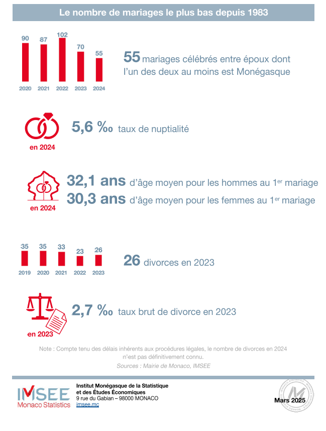 Un autre chiffre marquant est à relever : 55 mariages seulement ont été célébrés en 2024 impliquant au moins un Monégasque, soit « le niveau le plus bas depuis 1983 », selon l’IMSEE. Une baisse nette par rapport à 2023 (70 mariages) et surtout 2022 (102 mariages). En parallèle, 26 divorces ont été enregistrés en 2023.