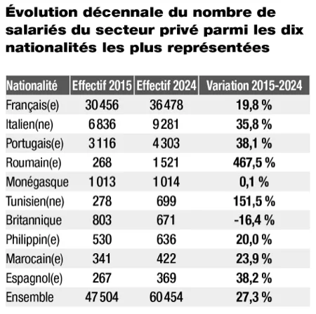 C’est ce qui s’appelle un grand brassage… Le cosmopolitisme bien connu de la Principauté se confirme aussi dans le monde professionnel. D’après les dernières données de l’Institut Monégasque de la Statistique et des Études Économiques (IMSEE), 145 nationalités se partagent aujourd’hui les postes du secteur privé en Principauté. Dix ans plus tôt, ces nationalités étaient au nombre de 128. Les Français restent en tête, représentant 60 % des salariés, soit près de 36 500 personnes. Les Italiens suivent avec 15 % (environ 9 300 salariés), puis les Portugais avec 7 % (plus de 4 300). Mais c’est du côté des Roumains que la progression est la plus frappante : 1 521 salariés en 2024 contre 268 en 2015, soit une augmentation de… 467,5 %. Une montée en puissance qui les propulse à la quatrième place du classement. Autre fait notable : les salariés de nationalité tunisienne ont notablement augmenté passant de 278 en 2015 à près de 700 en 2024. Ils sont 6e du classement.