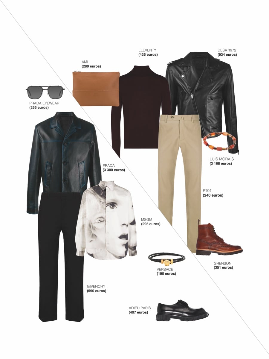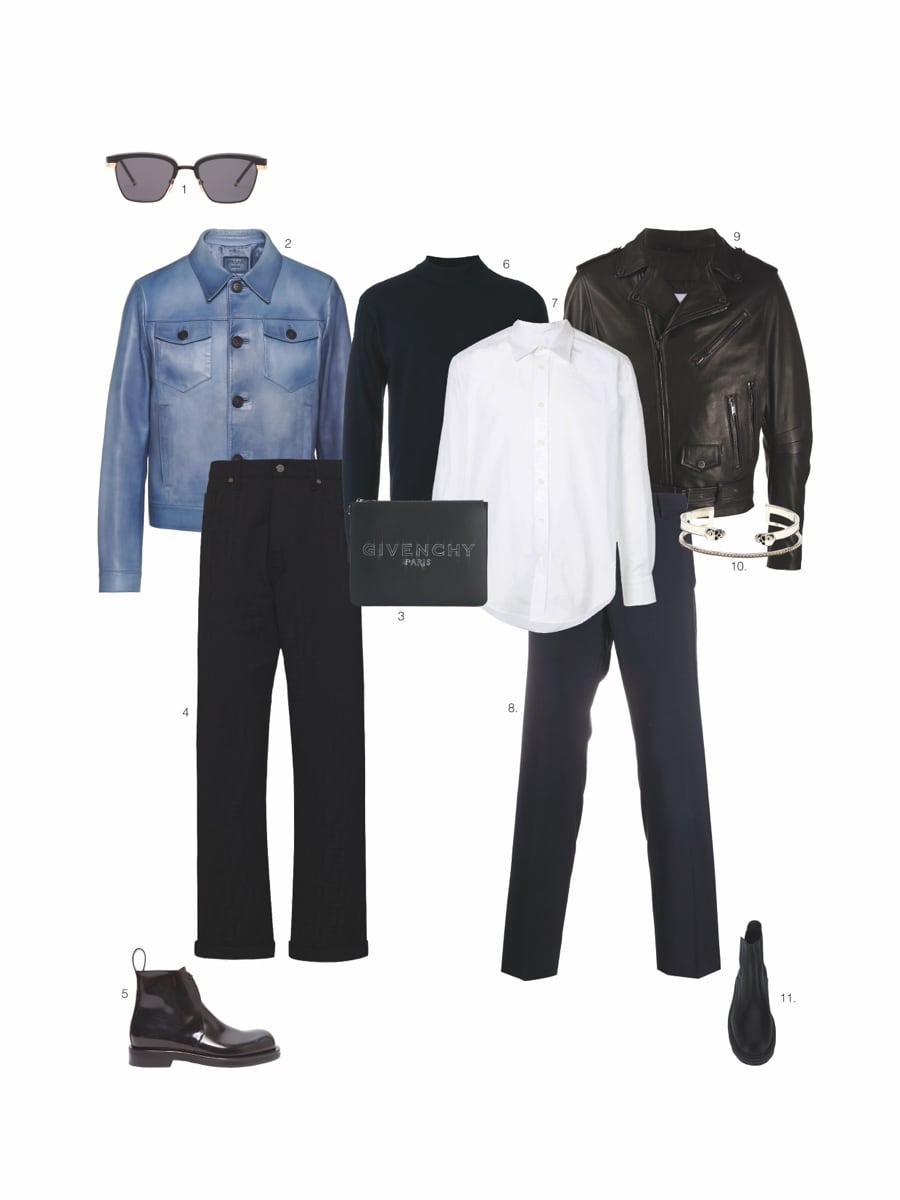 1. Lunettes de soleil, Jacques Marie Mage (627 euros) 2. Veste boutonnée, Prada (3 200 euros) 3. Pochette, Givenchy (595 euros) 4. Pantalon, Fendi (890 euros) 5. Bottes en cuir, Bottega Veneta (920 euros) 6. Pull ajusté, Fendi (550 euros) 7. Chemise classique, Caban (293 euros) 8. Pantalon, Prada (694 euros) 9. Veste, Tagliatore (1 061 euros) 10. Bracelet double, Alexander McQueen (310 euros) 11. Bottines chelsea, A-COLD-WALL* (643 euros).